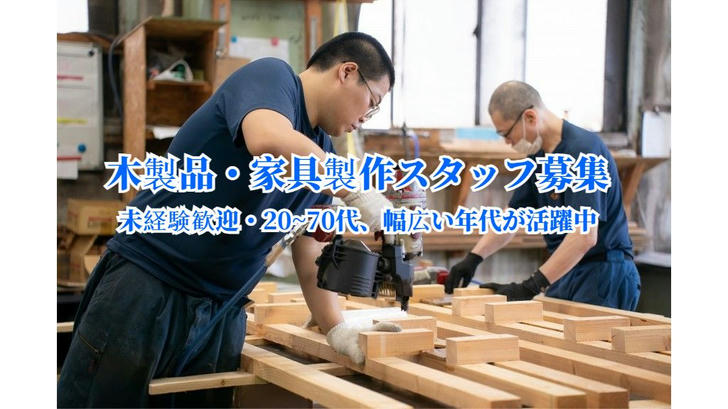 経験・資格は問いません。日本で働きたいですか?安定して楽な仕事をお探しですか?木製品・家具製作スタッフ募集:月給 26万円 ~ 33万円、履歴書不要、未経験も大丈夫、未経験者・業界未経験の方も積極的に採用しています。交通費規定支給、賞与あり、社会保険完備。20~70代、幅広い年代が活躍中!